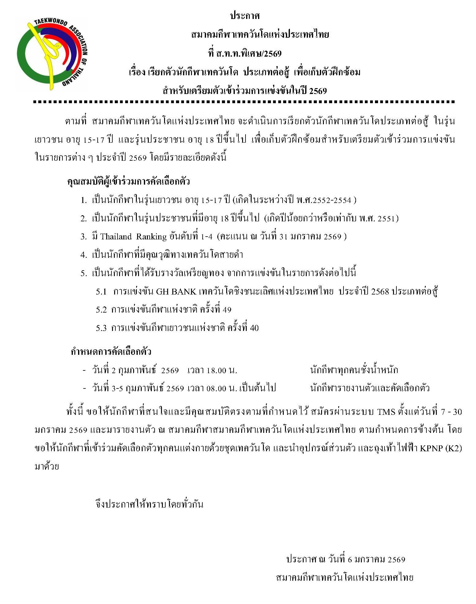 - การโอนย้ายคะแนนจากการเปลี่ยนรุ่นอายุ ให้ถือว่าการคัดตัวนักกีฬารายการนี้เป็นรายการแรก ตามระเบียบ THAILAND RANKING BYLAW - Jan 2025 หมวด 4 ข้อ 7.3 (คะแนนจะขึ้นโชว์วันที่ 31 มกราคม 2569)